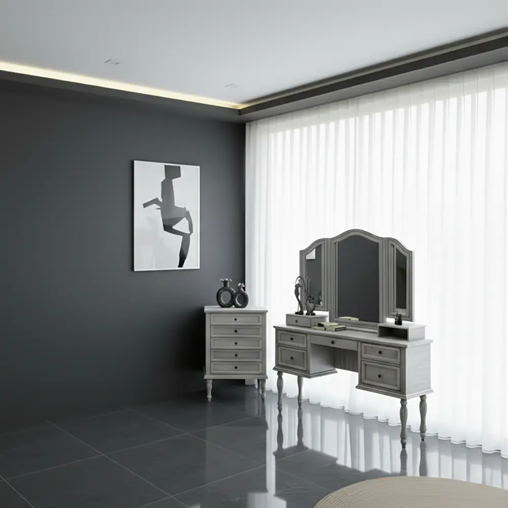 سرویس خواب دو نفره لادن از نظر طراحی ظاهری دارای خطوط متعادل و فرم منظم است که باعث میشود در دکوراسیونهای کلاسیک و نیمهمدرن به خوبی هماهنگ شود. تاج تخت با ساختاری مستحکم طراحی شده و در کنار رنگ پتینه خش جلوهای متفاوت ایجاد میکند. عرض 160 سانتیمتری تخت فضای خواب استانداردی فراهم میکند و در عین حال برای اتاقهای متوسط نیز مناسب است. میزآرایش با طول 140 سانتیمتر فضای کافی برای قرار دادن لوازم شخصی دارد و فایل با ارتفاع یک متر و پنج کشو امکان نظمدهی بهتر لباسها را فراهم میکند. پاتختیها با عرض 55 و عمق 40 سانتیمتر تکمیلکننده چیدمان منظم اتاق هستند.